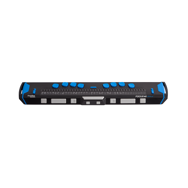 Il display Braille Focus Blue, con 40 celle Braille, ha un telaio composto da alluminio e acciaio. Sono stati aggiunti dei bumper per attutire i colpi e le celle Braille sono state fisicamente isolate.